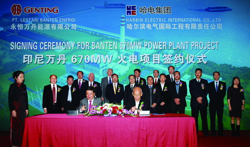 2012年11月8日,哈電國際與馬來西亞云頂能源公司在哈爾濱香格里拉大飯店隆重舉行了印尼萬丹670MW火電項(xiàng)目簽約儀式。出席簽約儀式的領(lǐng)導(dǎo)有哈電集團(tuán)董事長宮晶堃、哈電氣股份公司副總經(jīng)理張海權(quán);哈電國際公司領(lǐng)導(dǎo)有董事長兼總經(jīng)理郭宇、副總經(jīng)理張立偉、副總經(jīng)理董銀柱、副總經(jīng)理?xiàng)顟c利;兄弟單位領(lǐng)導(dǎo)有哈爾濱電機(jī)廠董事長兼總經(jīng)理邱希亮、哈爾濱鍋爐廠董事長兼總經(jīng)理王德興、哈爾濱汽輪機(jī)廠董事長兼總經(jīng)理陳冬石,以及相關(guān)合作伙伴代表等出席了簽約儀式。馬來西亞云頂能源公司首席執(zhí)行官王長純先生、高級副總經(jīng)理林仁傑先生,伯萊克.威奇國際公司副總裁林保德先生、項(xiàng)目總監(jiān)王蘇清先生等外方來賓共同出席了簽約儀式。簽約儀式由哈電國際副總經(jīng)理董銀柱主持。 下午17時(shí)18時(shí),哈電國際副總經(jīng)理董銀柱宣布簽約儀式正式開始。董總首先隆重介紹了出席此次簽約儀式的雙方領(lǐng)導(dǎo)和嘉賓,隨后哈電集團(tuán)董事長宮晶堃和云頂能源公司首席執(zhí)行官王長純分別代表雙方致辭。